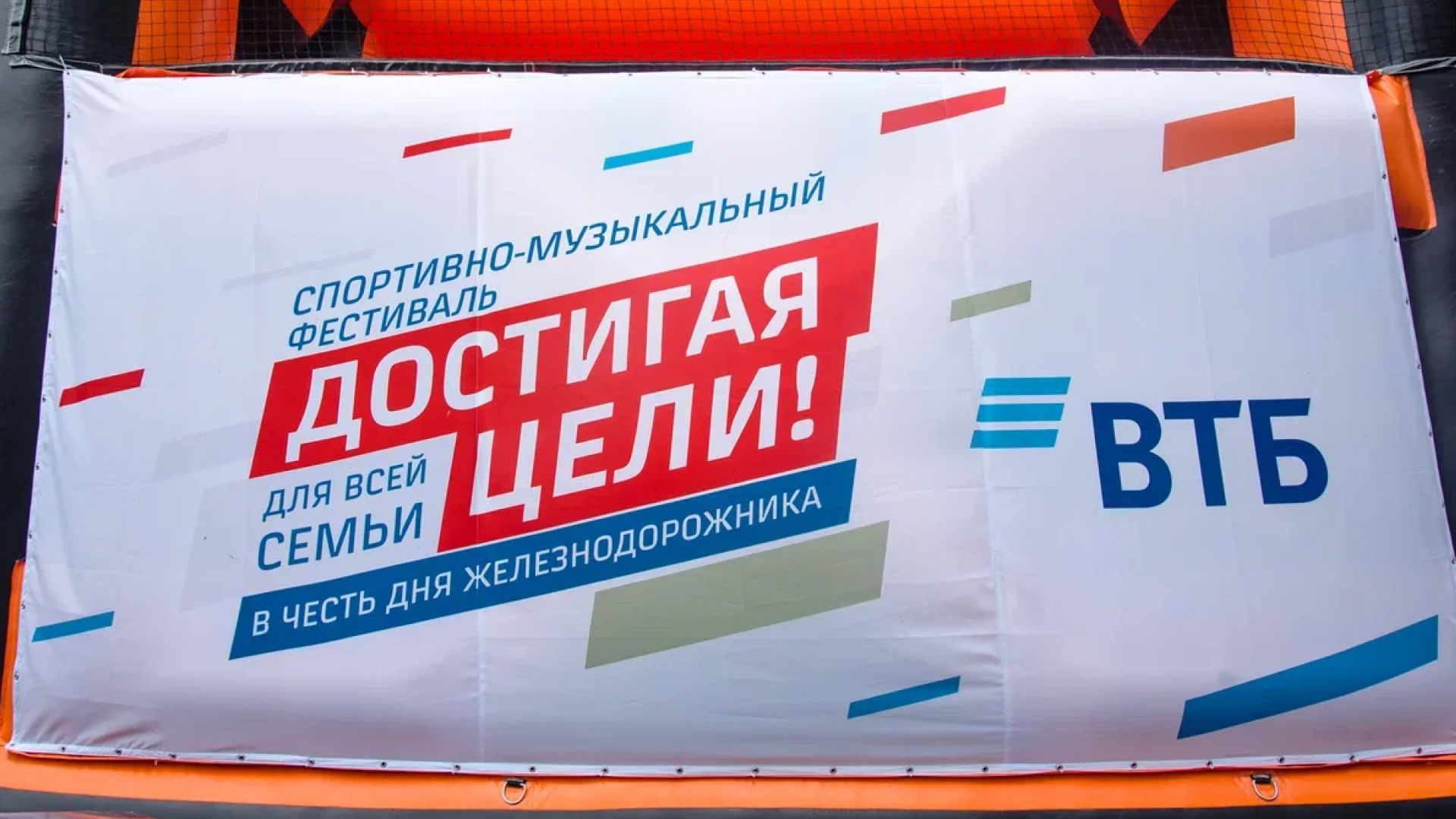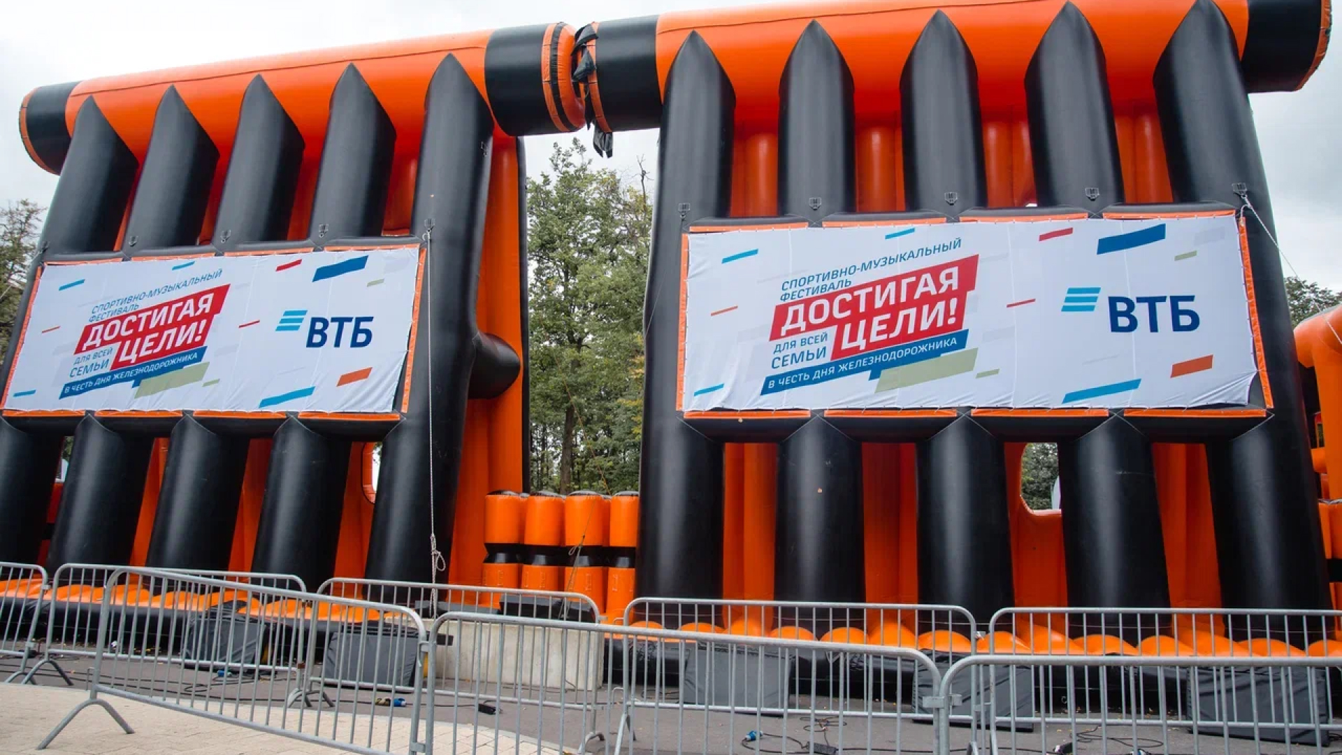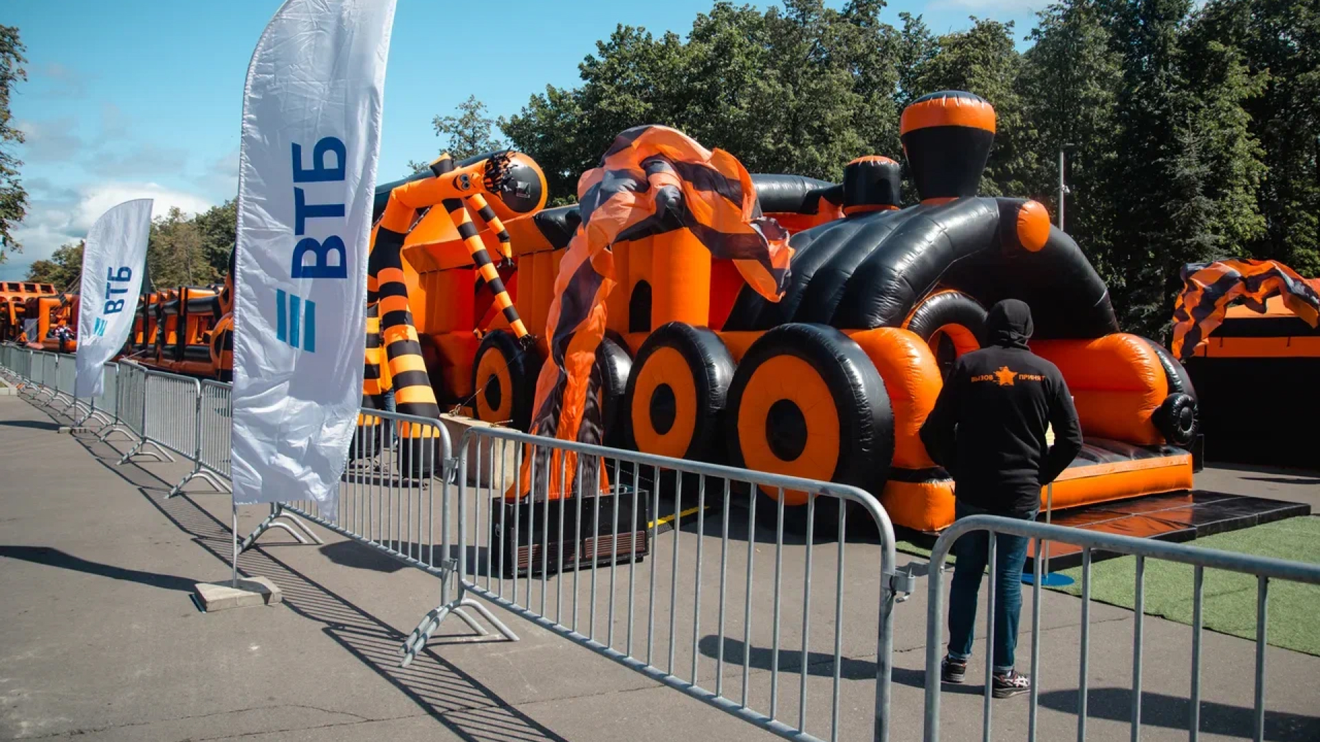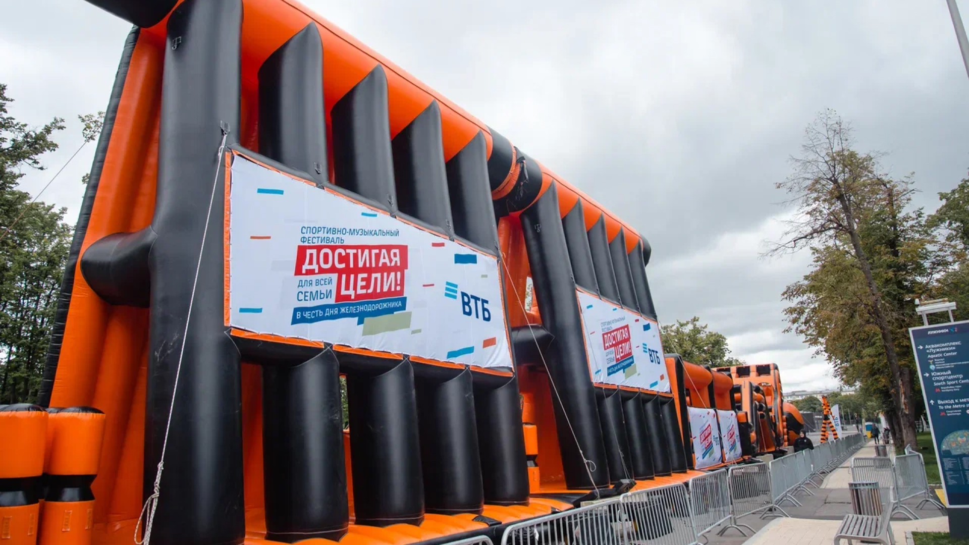 Большое количество участников собрала эффектная промо акция ко дню железнодорожника, проведенная совместно РЖД и ВТБ. Центром спортивных соревнований стала уникальная трасса из надувных элементов от “Вызов принят”, выполненная в виде поезда.