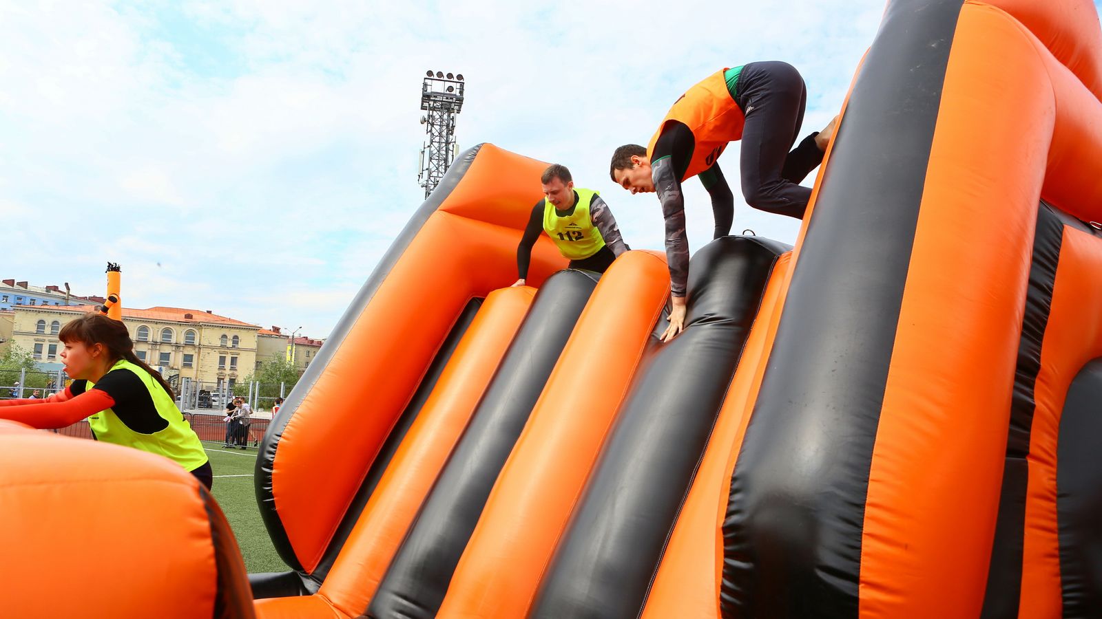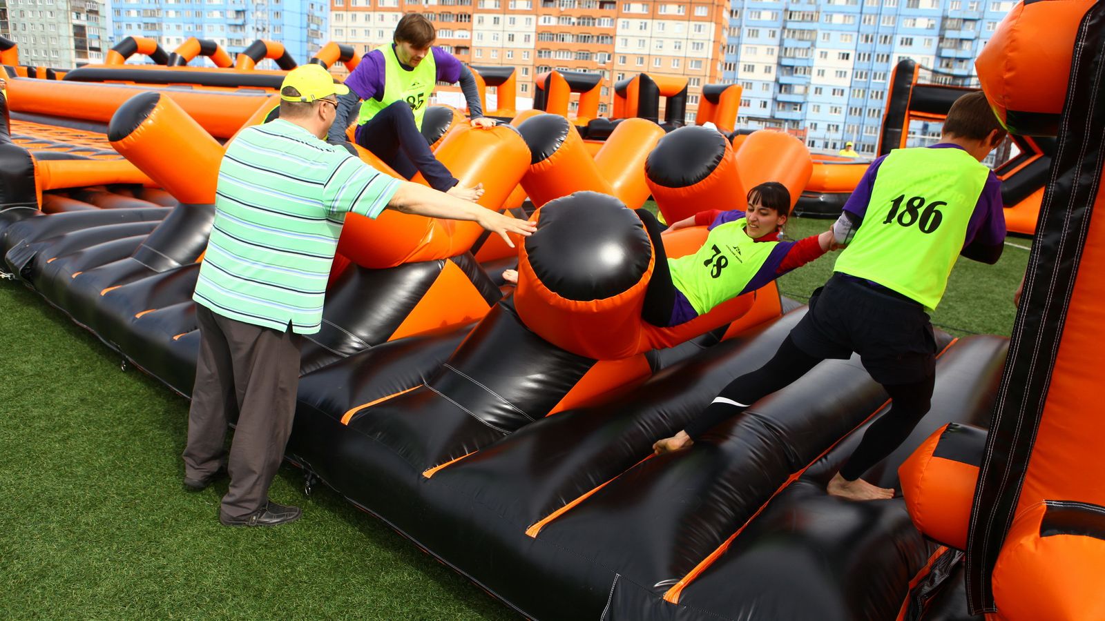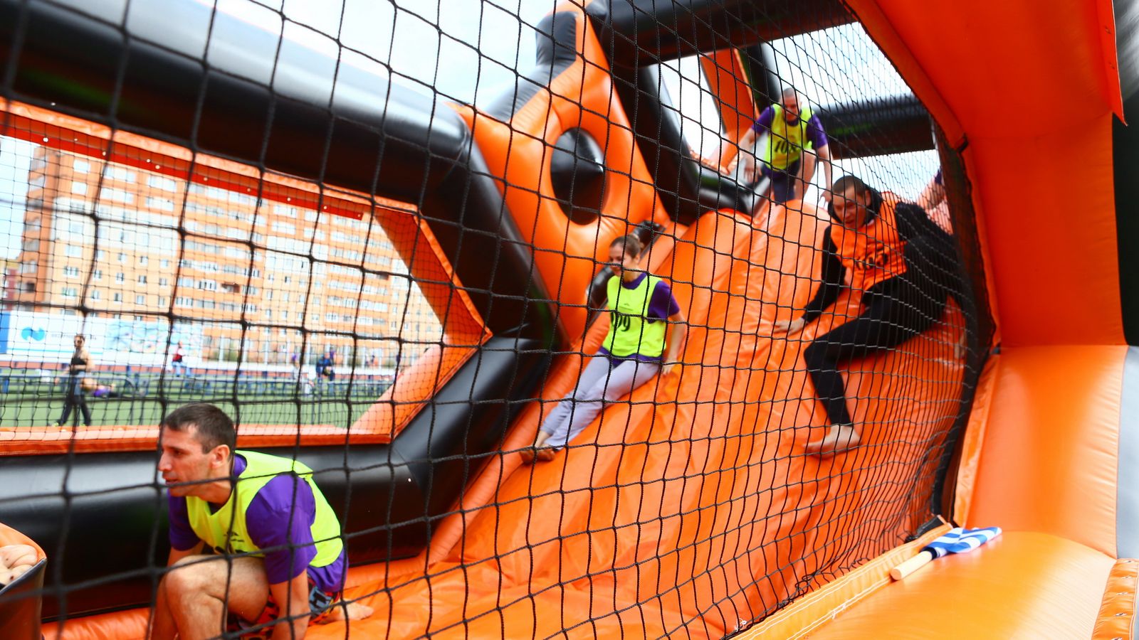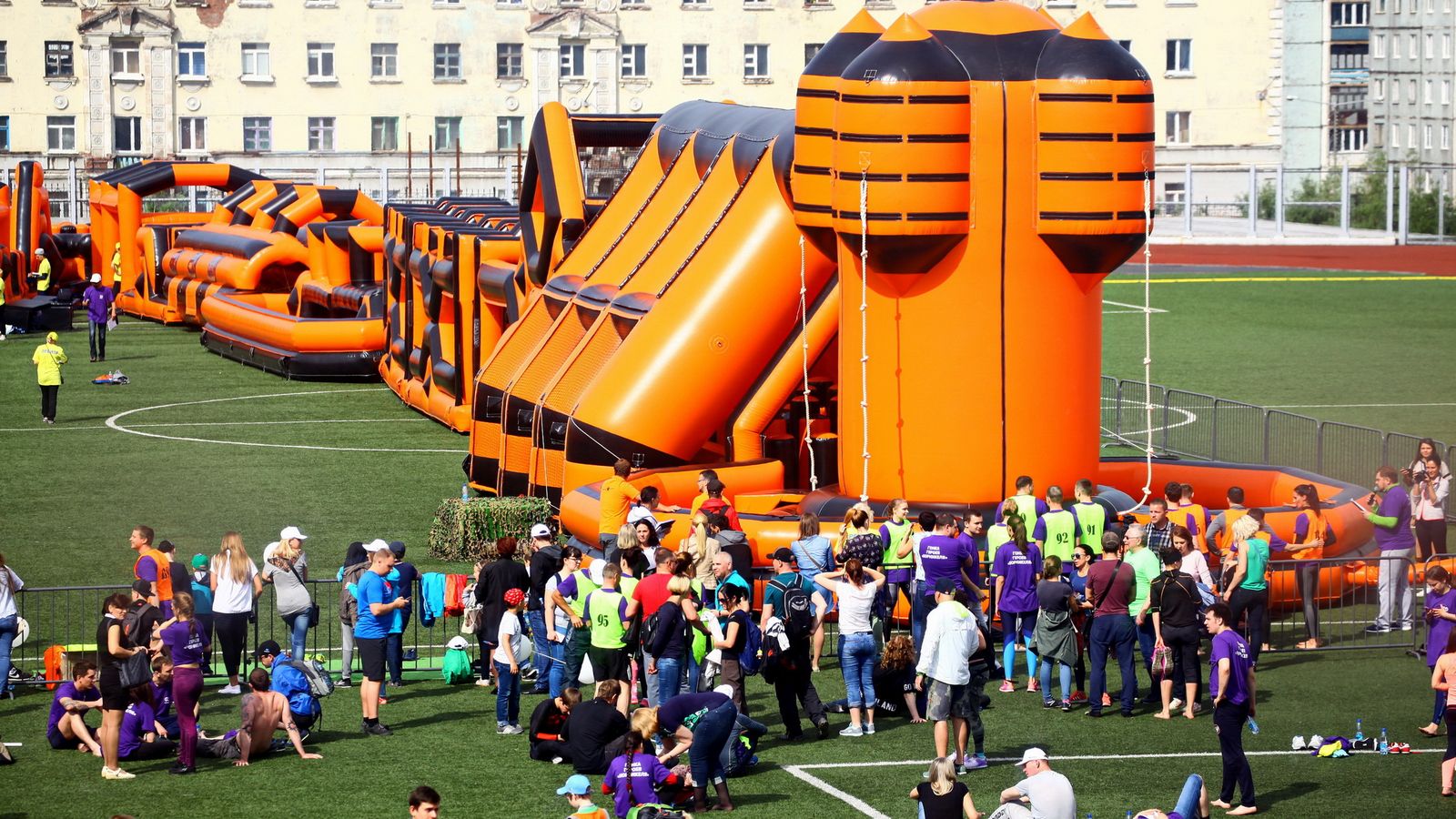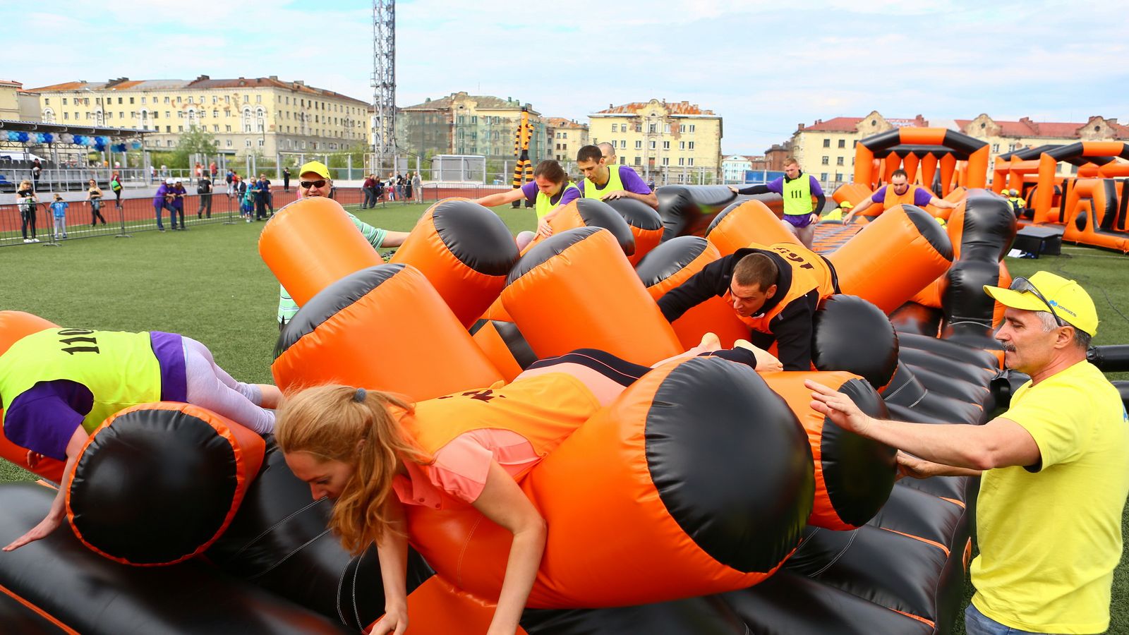 «Вызов принят» предоставили для участников спортивной гонки одну из самых протяженных и сложных надувных трасс с препятствиями. Яркая черно-оранжевая надувная конструкция батутной трассы возвышалась над искусственным газоном городского стадиона и уже заранее среди финалистов слышались восторженные возгласы.