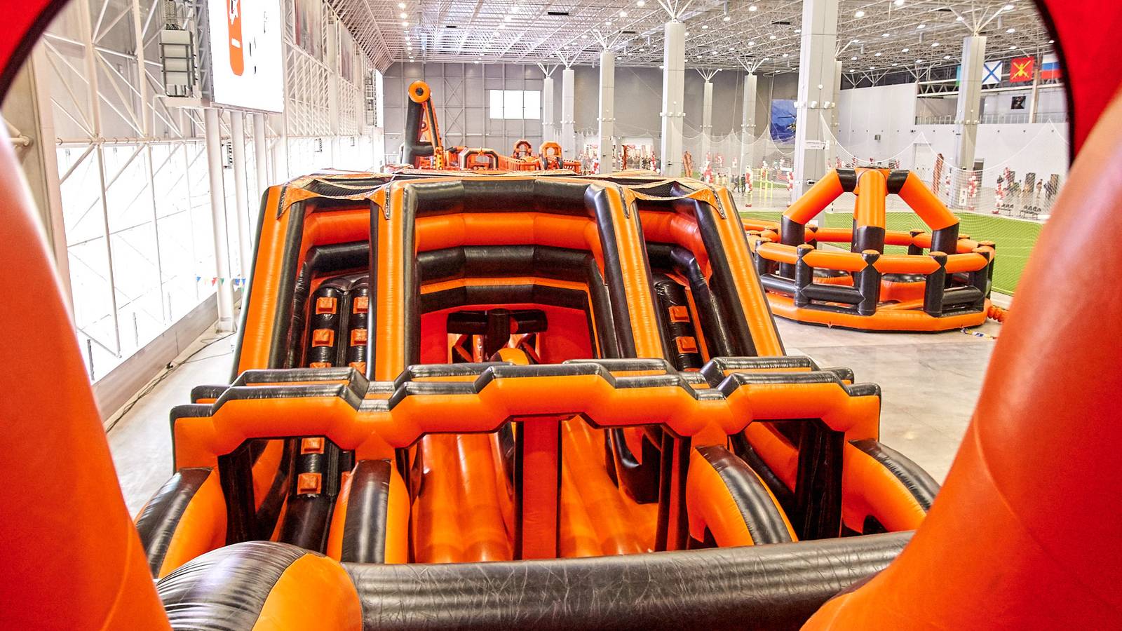 Комбинированная трасса понравилась всем, ведь здесь можно было вдоволь прыгать, забираться на горки и спускаться с них, лавировать между надувными столбами, забираться по канату и даже проехать быстрее соперника заданное расстояние на велотренажере.