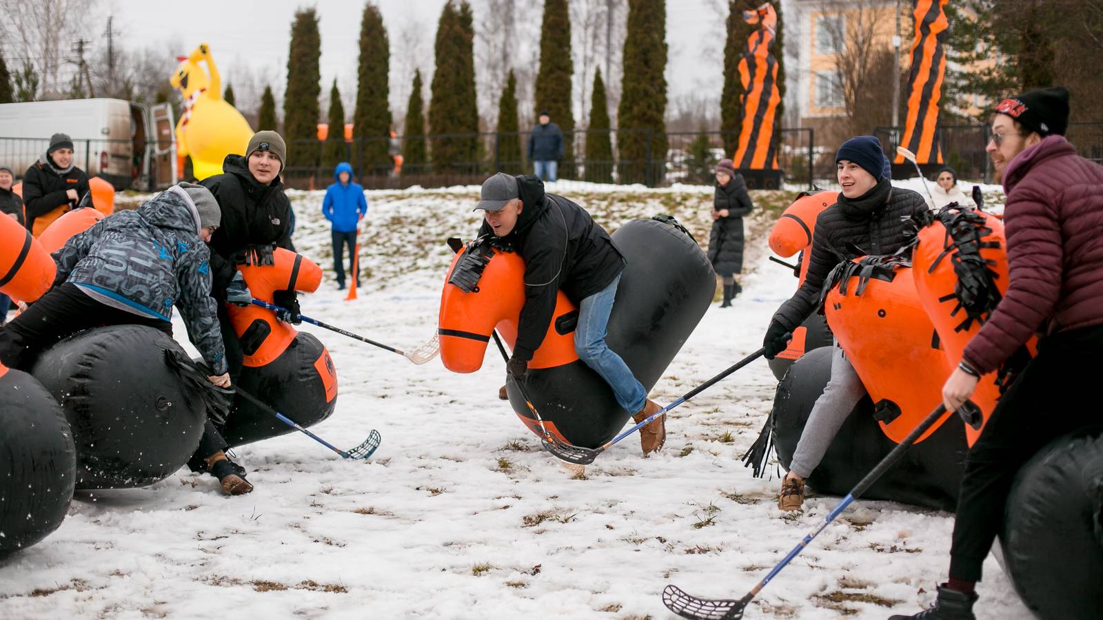 Эффектное патриотичное оформление надувных элементов в цветах георгиевской ленты особенно выигрышно смотрится зимой на фоне белого снега. Атмосферу праздника дополняет аэромен и имитация огня из развевающейся в потоке воздуха черно-оранжевой ленты. Согреться и восполнить затраченные на прохождение испытаний килокалории участники спешили в зоне кейтеринга.